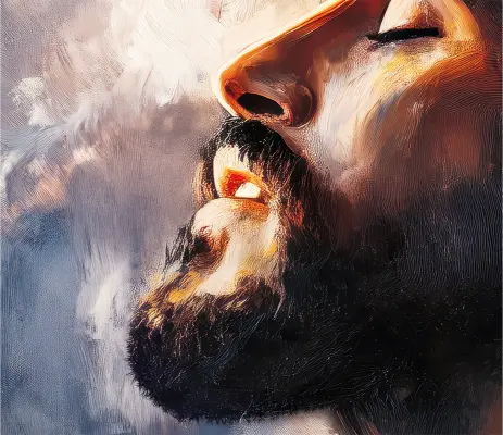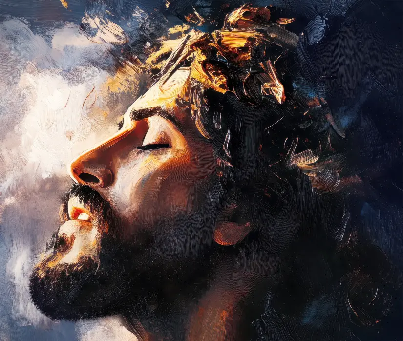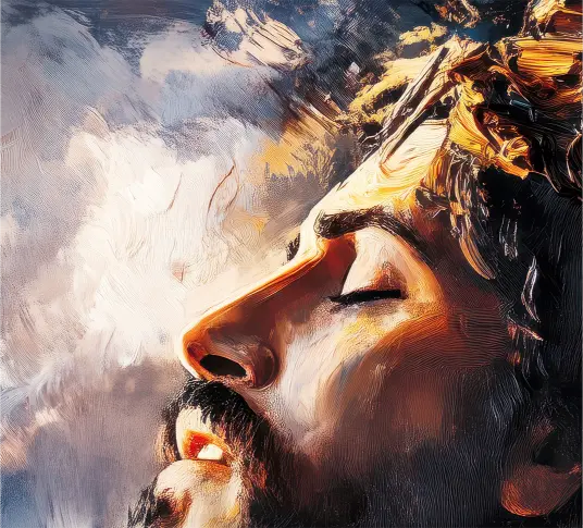 This image portrays a figure in a moment of spiritual communion, illuminated by a divine light symbolizing God’s presence. With eyes closed in peaceful contemplation, it evokes the biblical themes of anointing, revelation, and closeness to God.